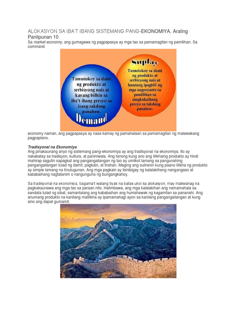 Sistemang Pang-ekonomiya bAlokasyon sa Ibat ibang Sistemang Ekonomiya 1. Paano mo ilalarawan ang market economy. Araling Panlipunan Module 1 Grade 9.